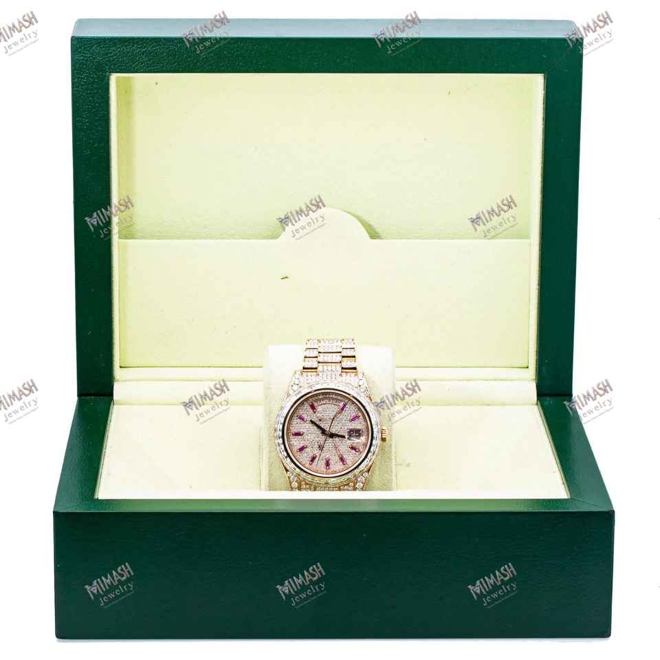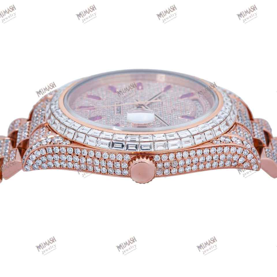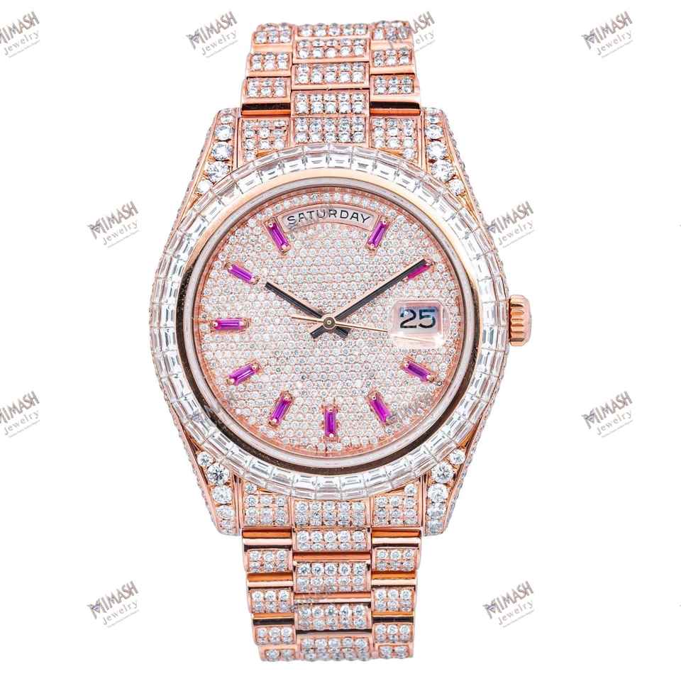 Edición limitada Rose Gold Eye Catching Pink Baguette Dial Stick Bar Totalmente Iced Moissanite Diamond Watch Auto Day and date Watch