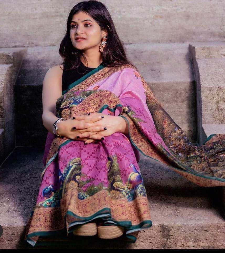 Sari de lino con estampado digital con estampado de Kalamkari en Sari completo con borlas elegantes en blusa para correr Pallu de proveedor indio