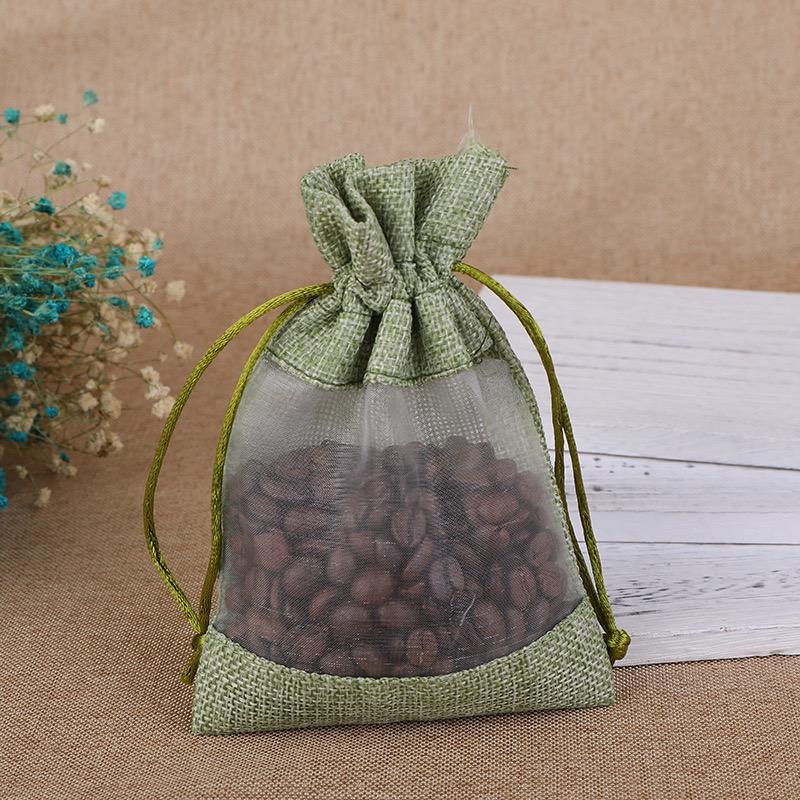 Nombre del Producto:Bolsa de regalo de lino con cordón y ventana de organza, bolsas de yute de arpillera
