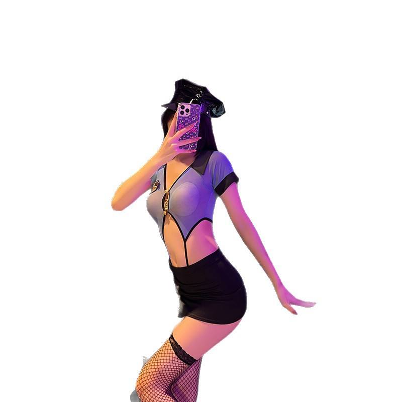 Lencería Mujer Policía Sexy Uniforme Correa Bodycon Vestido caliente Conjunto de una pieza Hollow Out Secretary Apasionado Ver a través de las mujeres