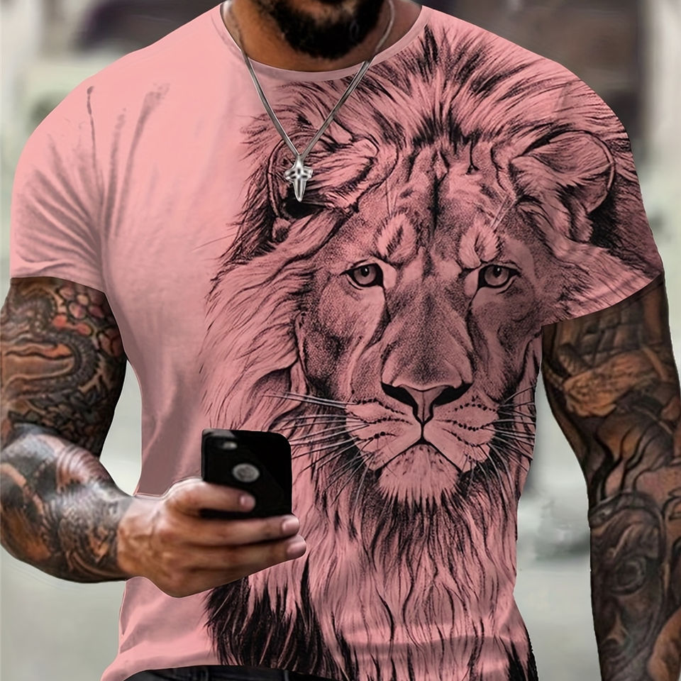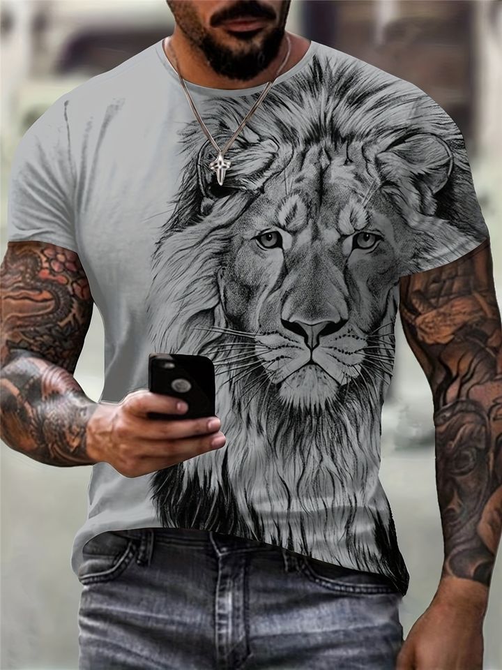 Camiseta Cómoda para Hombre con Estampado de León, 180 Gramos, Tejido de Punto, Manga Corta, Estilo Casual Elegante, Camiseta Gráfica, Ropa de Verano