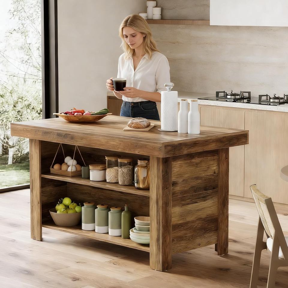 Mesa de Cocina Little Tree de 55 Pulgadas, 3 Niveles, Estilo Rústico Moderno, Color Marrón, con Almacenamiento, Amplia Superficie de Trabajo, Barra para Café