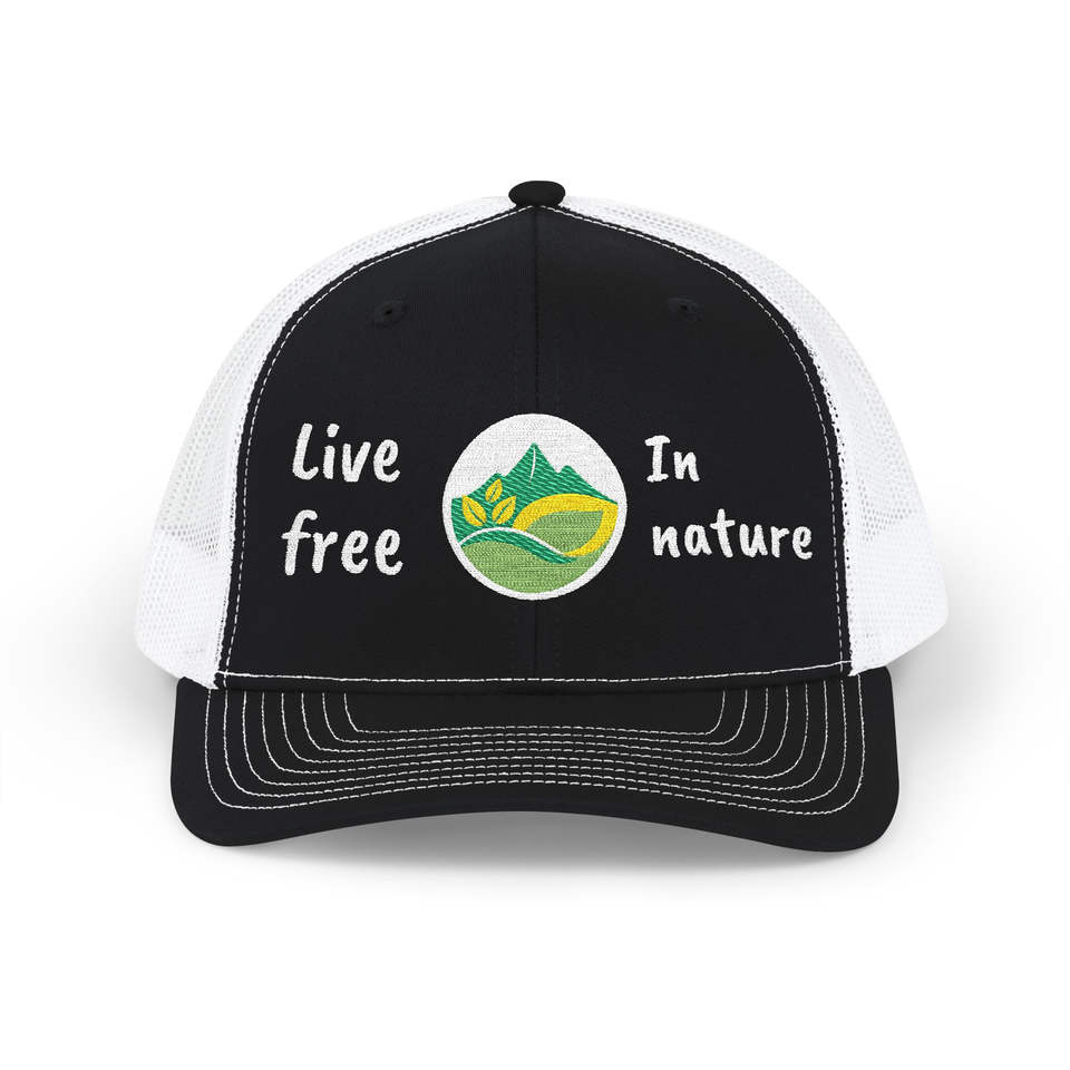 Gorra Trucker Bordada con la Frase 'Live Free in Nature', Logotipo Personalizado, Talla Única, Nylon y Felpa, Visera Plana, Estilo Formal