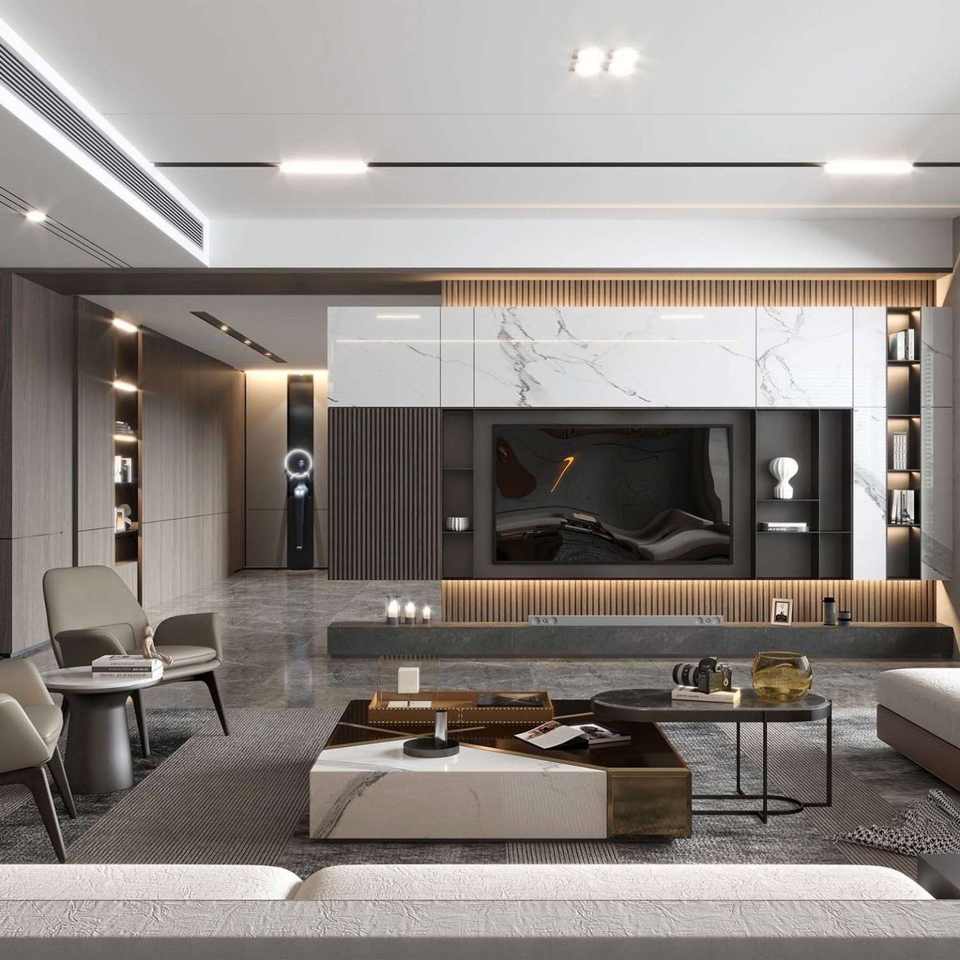 Sala de estar Blanco Negro TV Centro de entretenimiento Moderno Media Wall Tv Gabinete Diseño Muebles montados Soporte de TV de madera de lujo