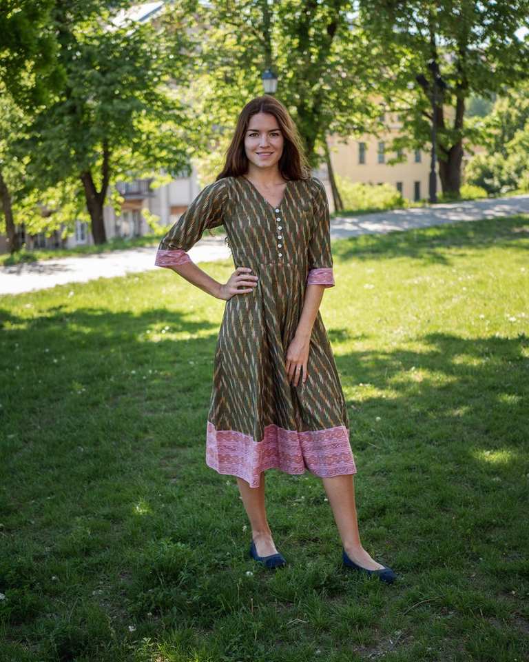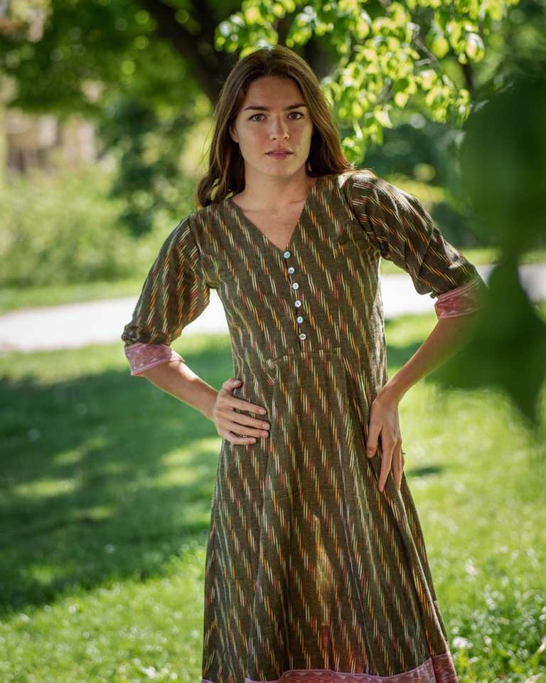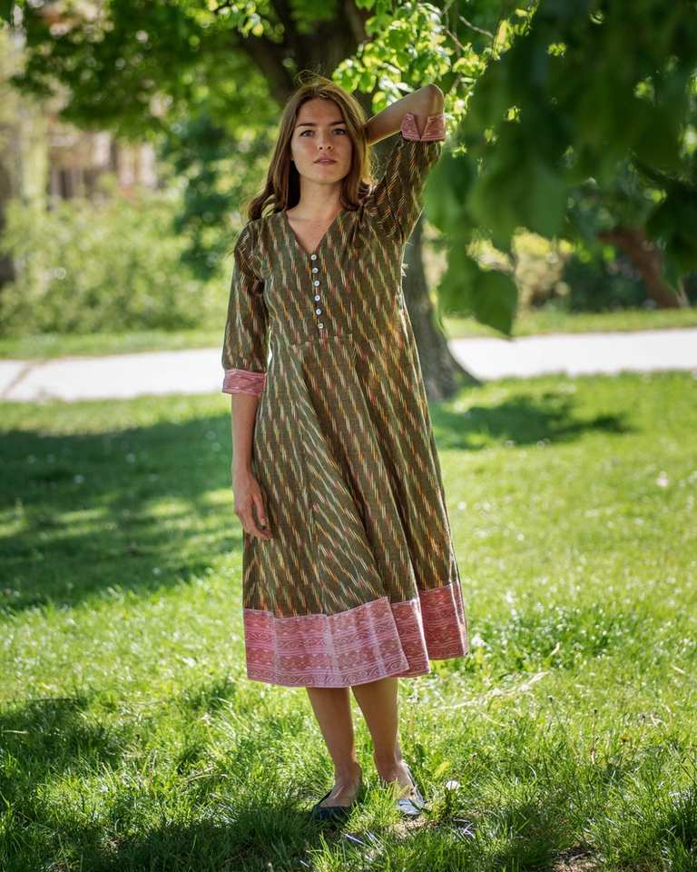 Vestido Liza de Algodón Ikat Tejido a Mano, Estilo Bohemio, Largo hasta la Pantorrilla, Gris Rosa, Moda Ética