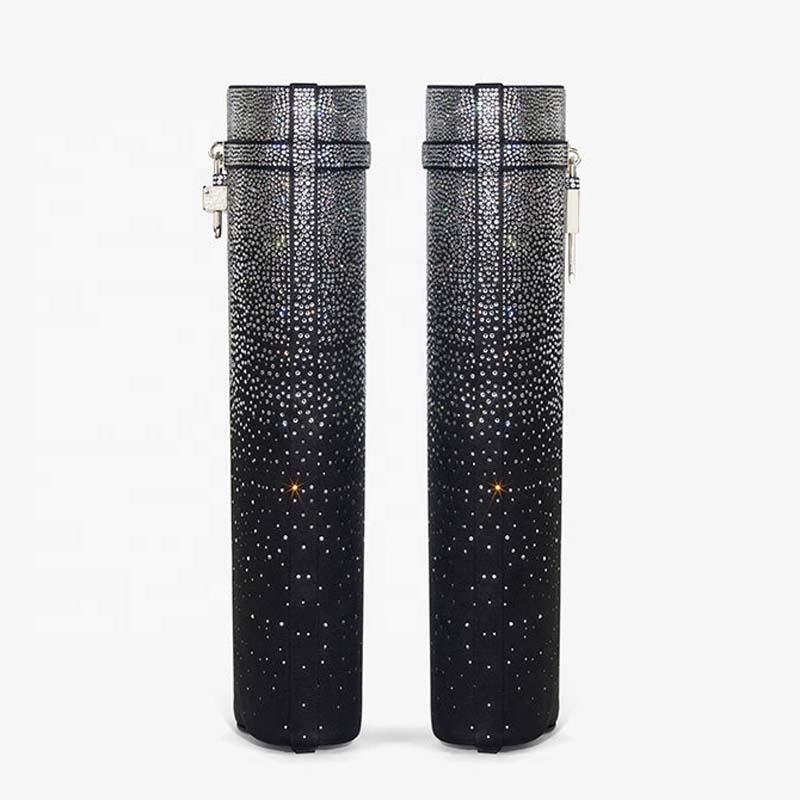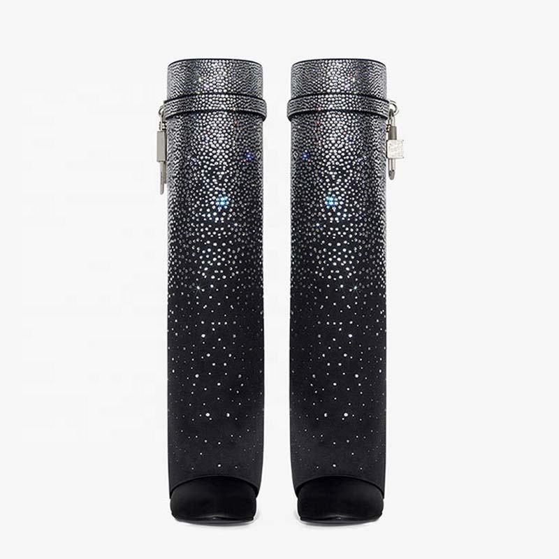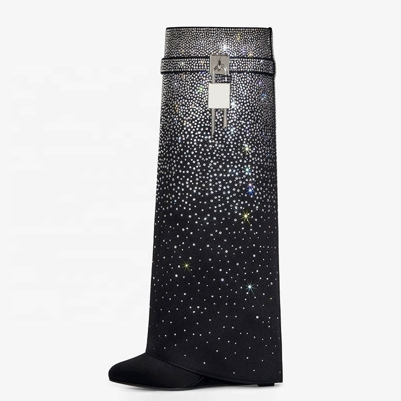 Botas largas de tacón de cuña Lock Shark con superposición, botines hasta la rodilla para mujer, con punta redonda y diamantes brillantes, zapatos para dama