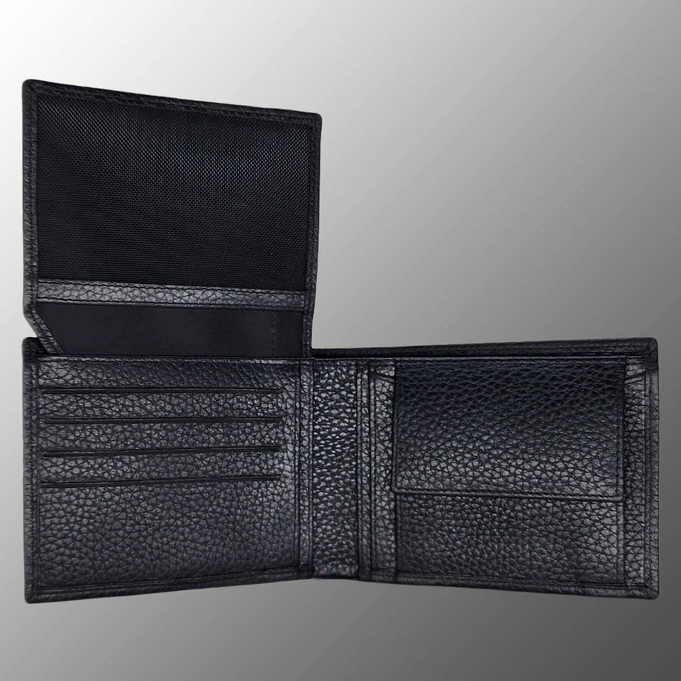 Cartera plegable de grano completo de cuero auténtico en relieve con logotipo para hombre, múltiples ranuras para tarjetas de moneda, tarjetero personalizable con logotipo