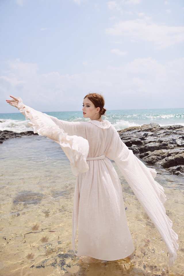 Bata larga estilo Kimono para mujer en gasa de lino suave Vestido de novia de longitud completa con mangas largas y ajuste relajado