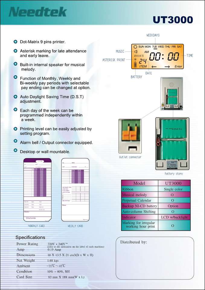 Reloj perforador de tarjeta de larga duración, máquinas registradoras de tiempo, reloj de tiempo Ut3000 Needtek para empleados