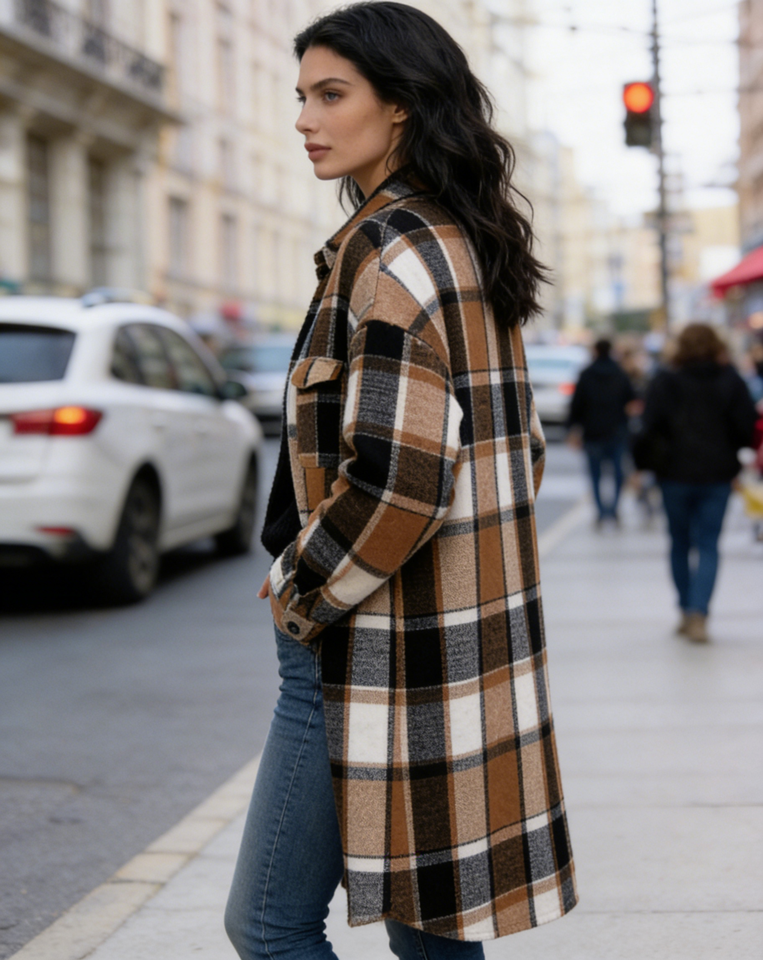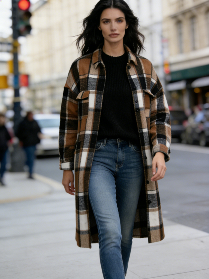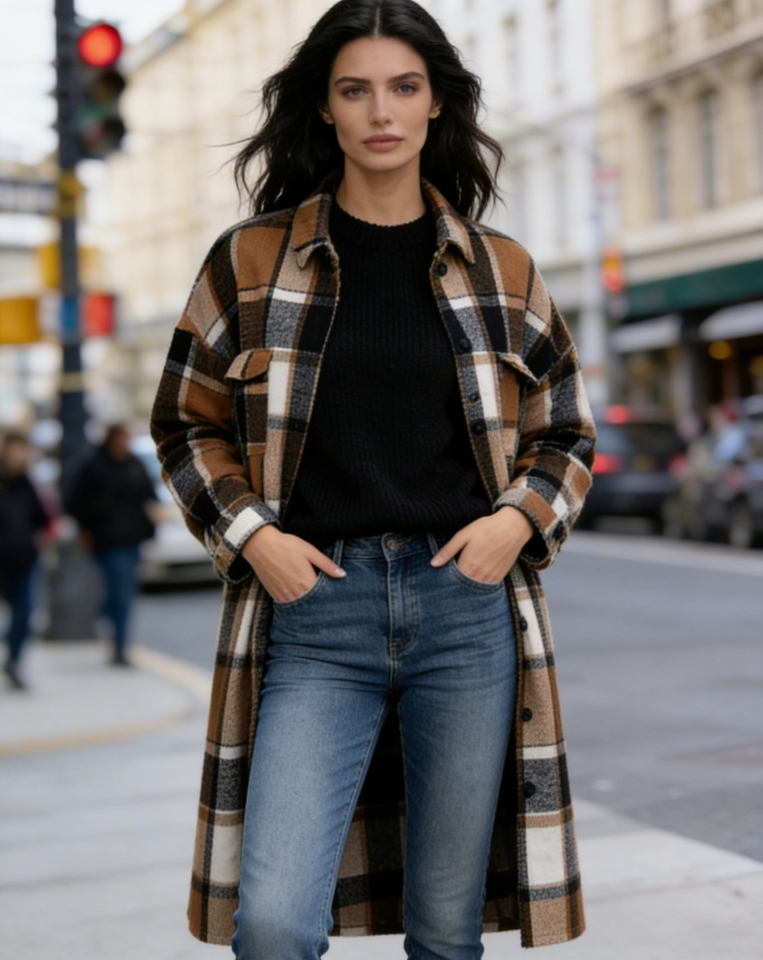 Chaqueta Larga a Cuadros de Mezcla de Lana para Mujer - Estilo Retro Americano, Oversize, Largo hasta la Rodilla, con Botones y Bolsillos Delanteros Dobles