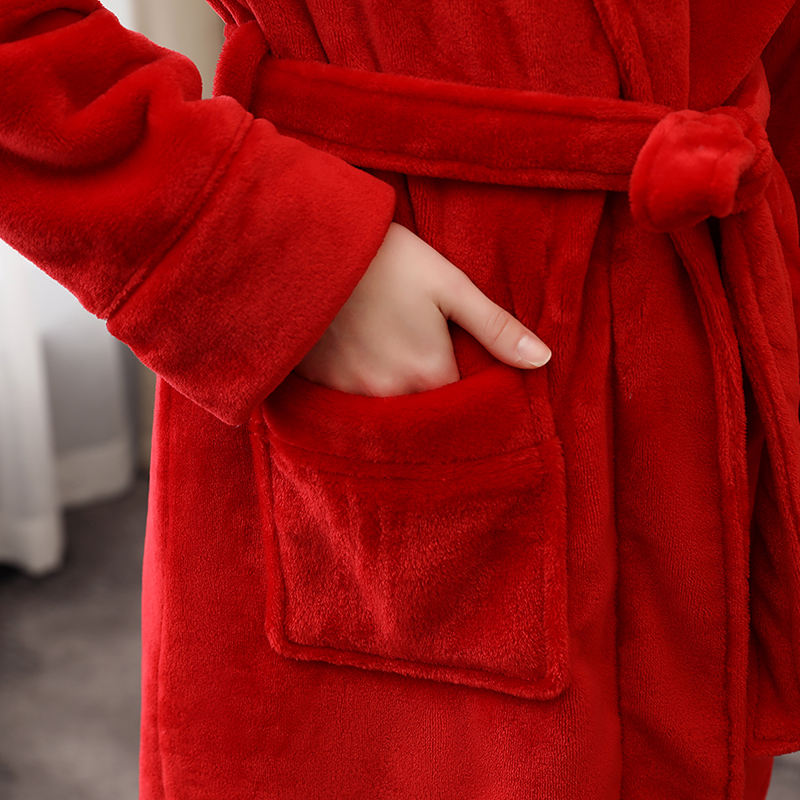 Albornoz de lana de franela roja para parejas, bata térmica de manga larga para amantes del invierno, Color sólido