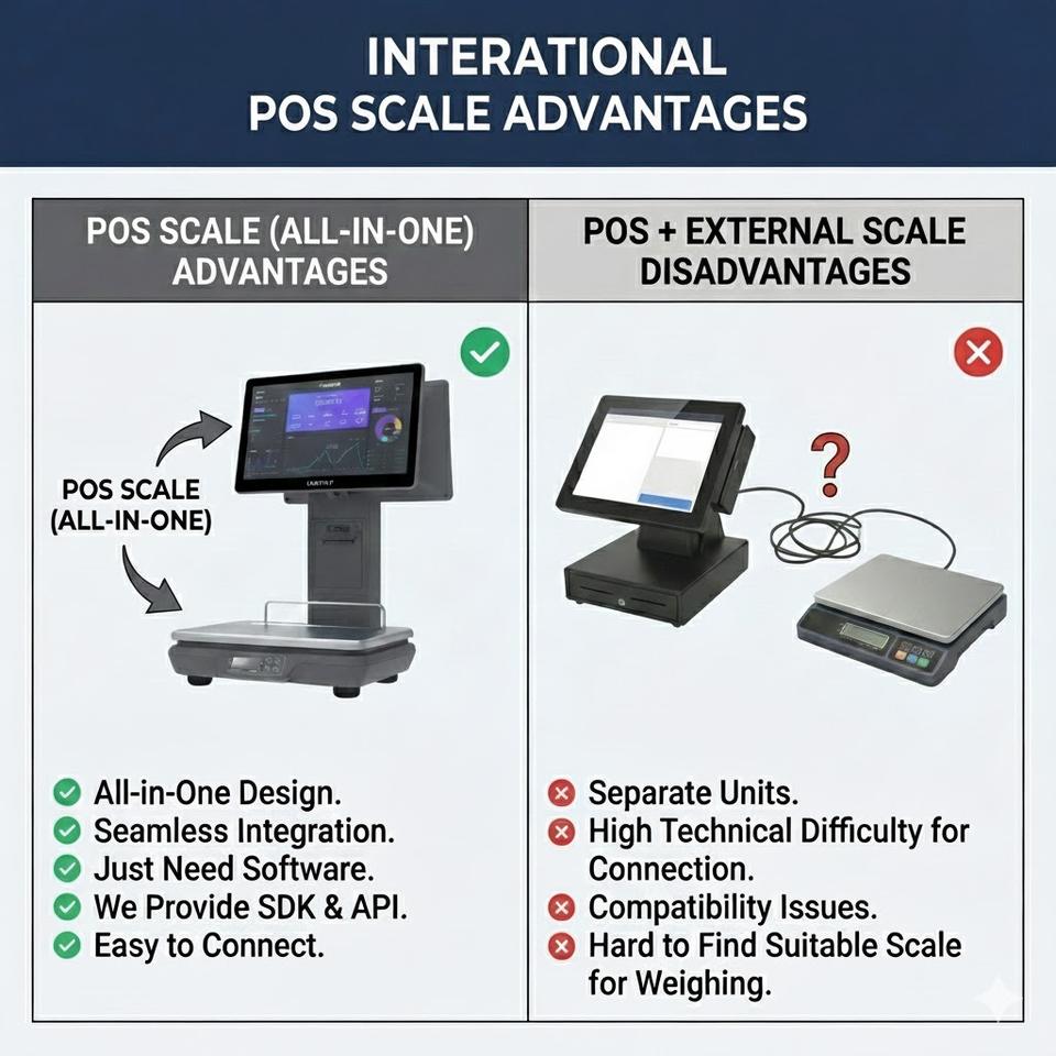 Balanza POS Inteligente con IA Todo en Uno LongFly con Caja Registradora de Doble Pantalla y PC Táctil para Uso en Supermercado