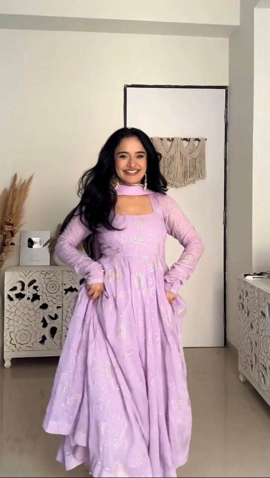 Looking Best Color Hermoso diseño Heavy Faux Georgette Tela 3/4 Manga Patrón Hasta el suelo Maxi vestido con Dupatta Set