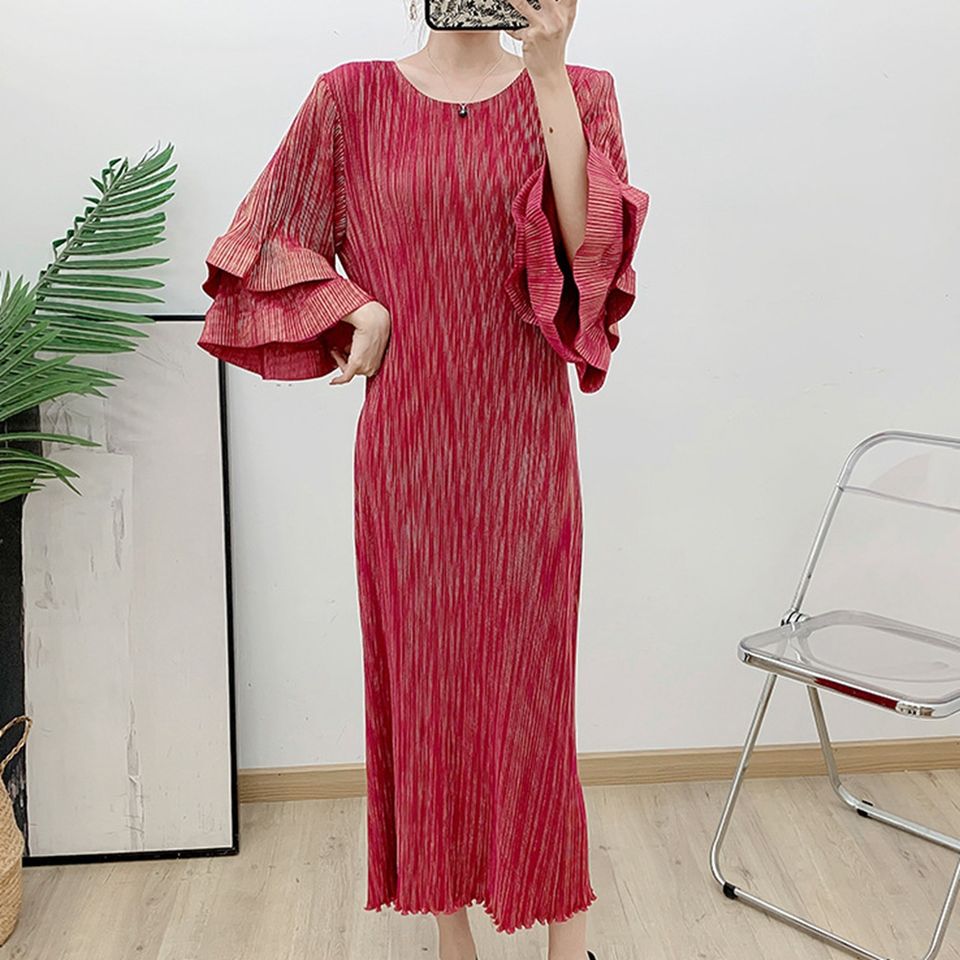 Vestidos Midi Elegantes para Mujer, Talla Grande, con Mangas Holgadas Tipo Trompeta, Tejido Sólido, Ecológico, Lavable, Personalizable OEM