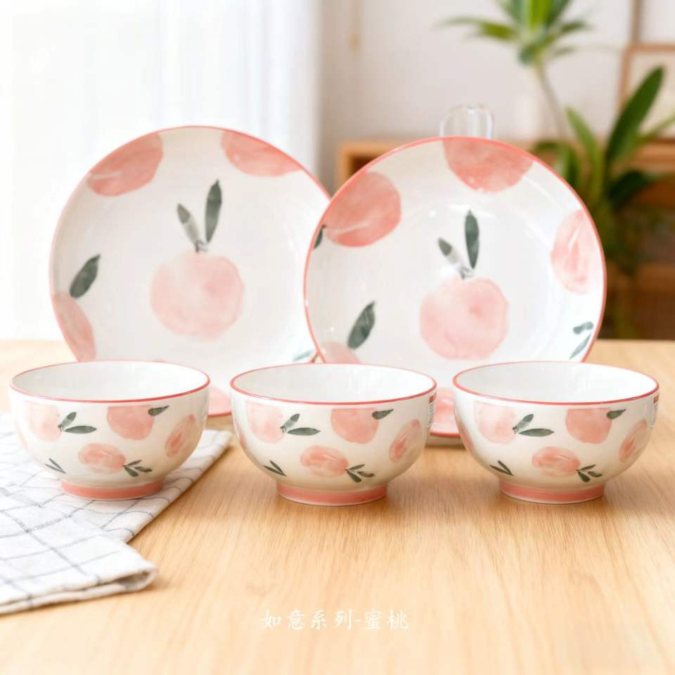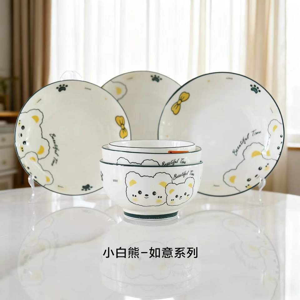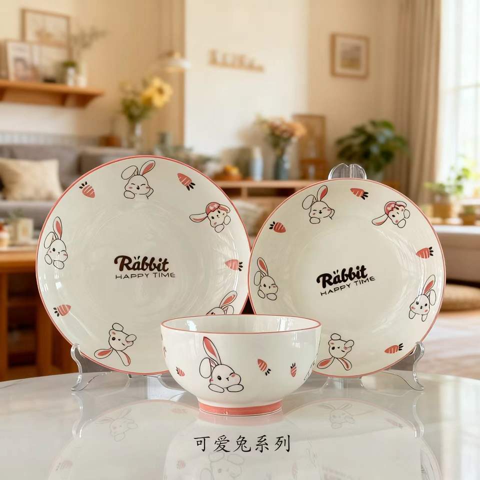 Encantador Juego de Vajilla Infantil de Cerámica con Diseño Rabbet y Color Subesmaltado, que Incluye Plato, Tazón, Taza y Cuchara, Apto para Microondas, en Caja de Regalo