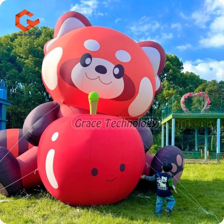 Mascota inflable de la historieta de la panda roja, Mapache inflable sosteniendo Apple, Globo animal inflable de encargoTipo