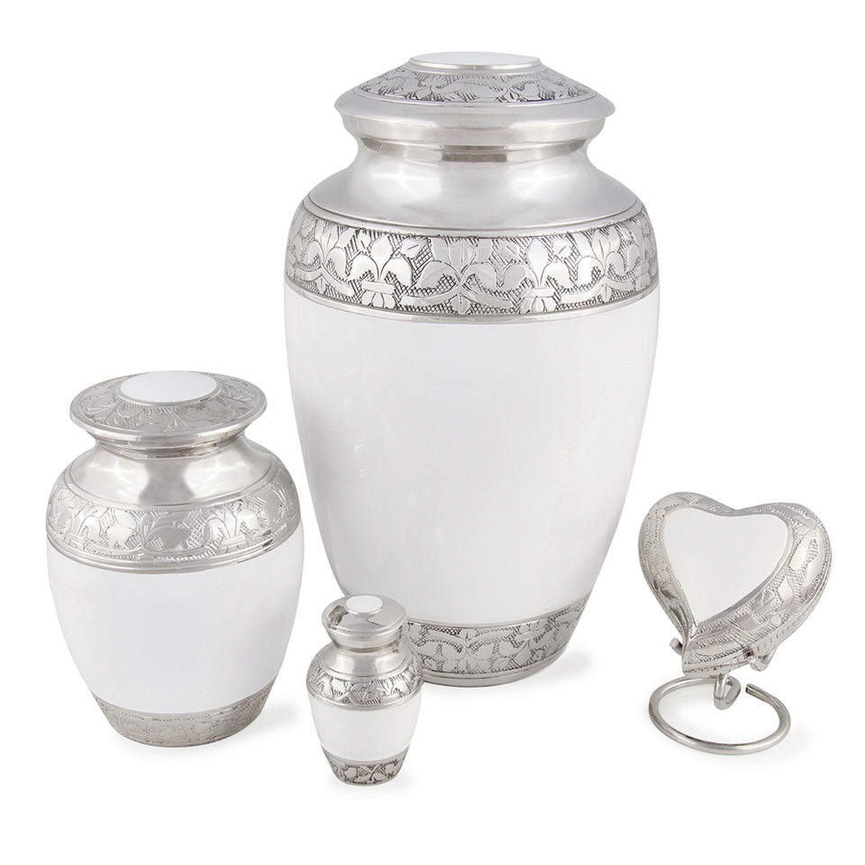 Loving Memorial Solid Urn Set es una colección de urnas de metal griego que incluye una urna para adultos de tamaño completo, una ficha y un corazón de recuerdo