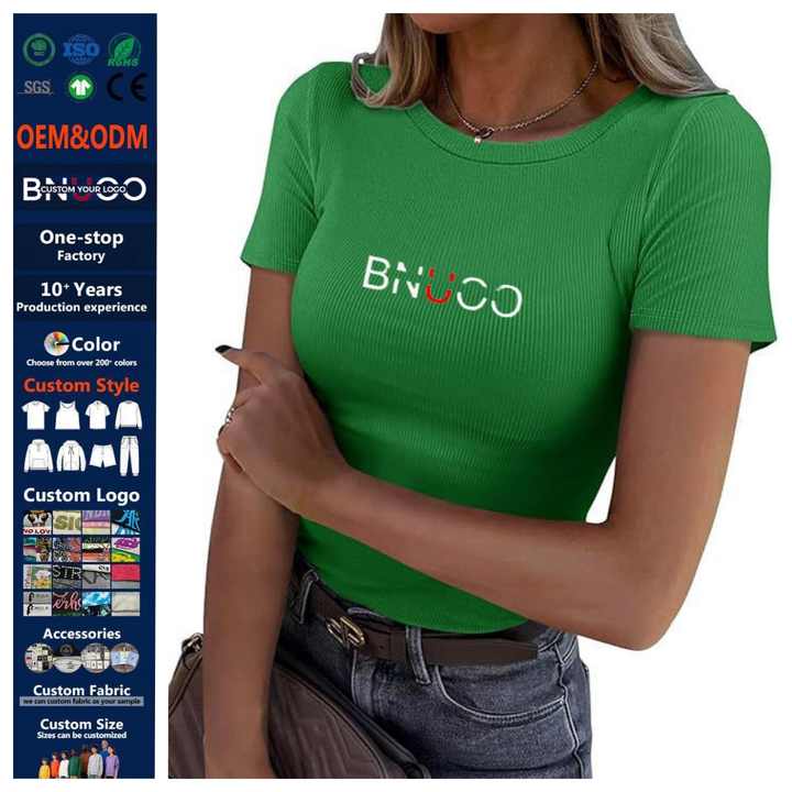 Camisetas Cortas Acanaladas de Manga Corta Ajustadas Estilo Urbano con Bajo MOQ, Tejido Elástico, OEM, para Mujer