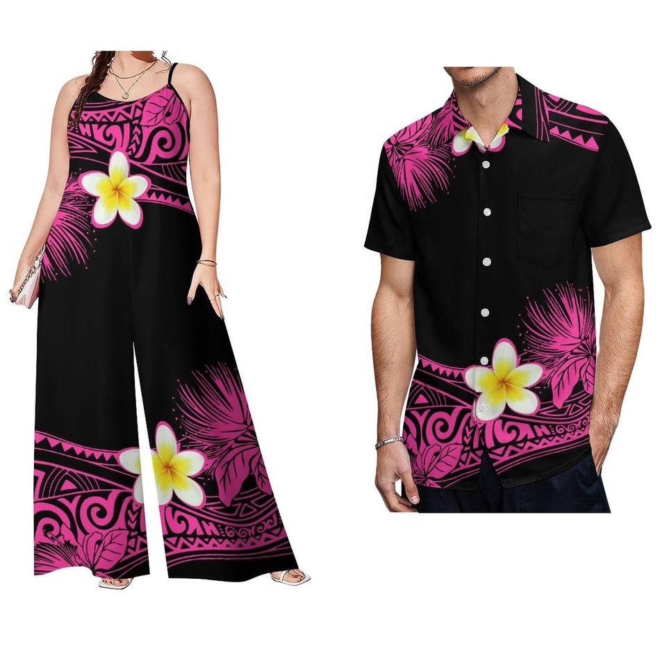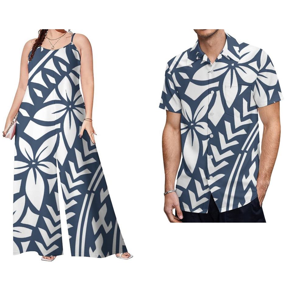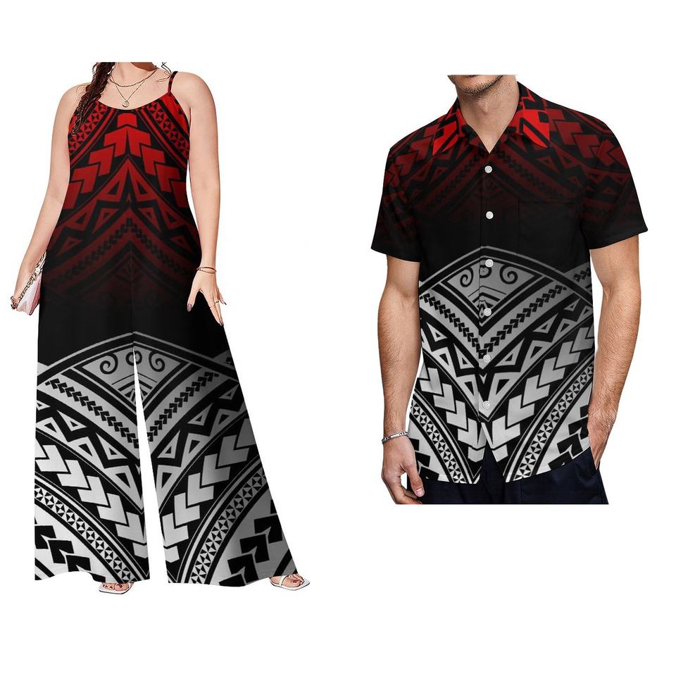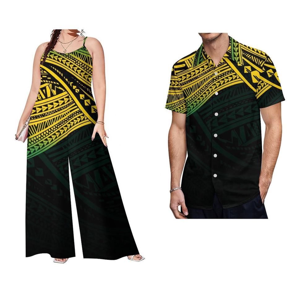 Conjuntos Casuales de Ropa Polinesia de Tallas Grandes a Bajo Precio, Conjuntos de 2 Piezas con Estampado Tribal Samoano para Parejas, Camisa para Hombre y Romper Holgado para Mujer
