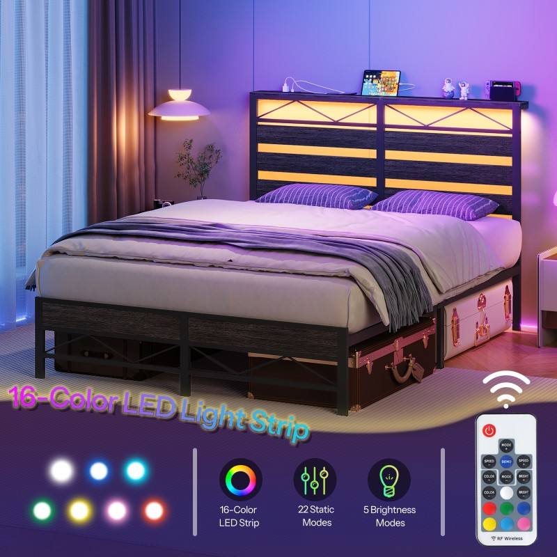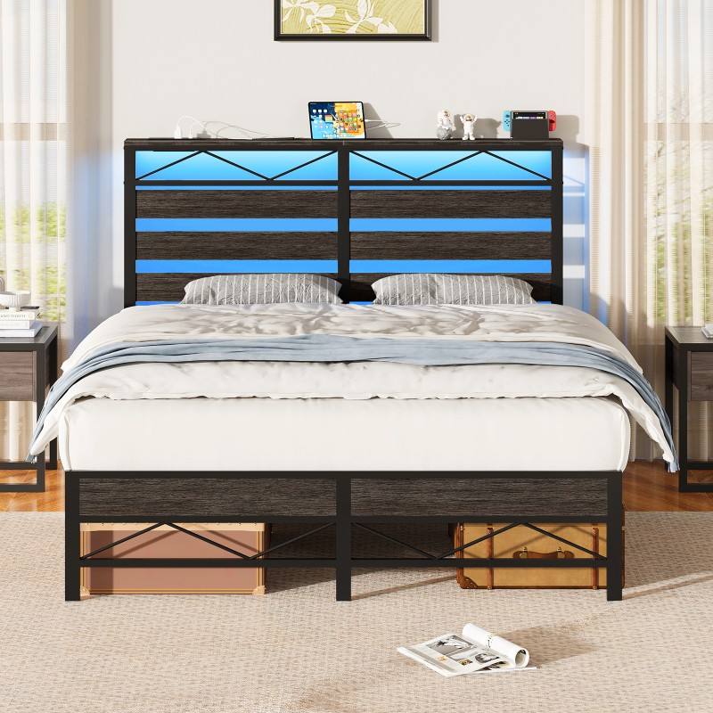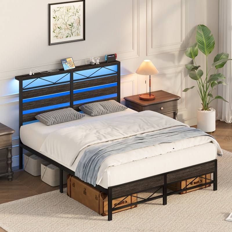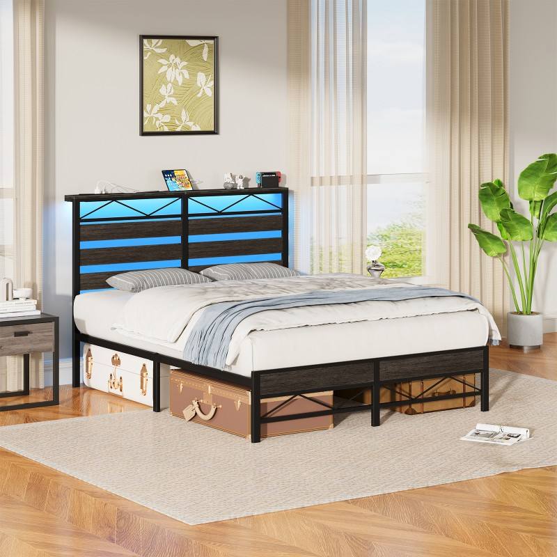 Base de Cama Individual/Matrimonial/Queen Size, Base de Cama de Plataforma de Metal con Cabecera, Base de Cama LED con Estación de Carga, Silenciosa