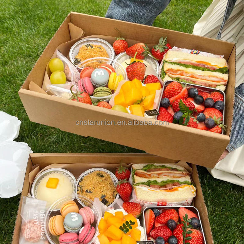MOQ inferior, ventana de fábrica, papel Kraft, caja de Picnic para acampar, cajas de pastel de postre, caja de embalaje de Picnic, cartón para llevar