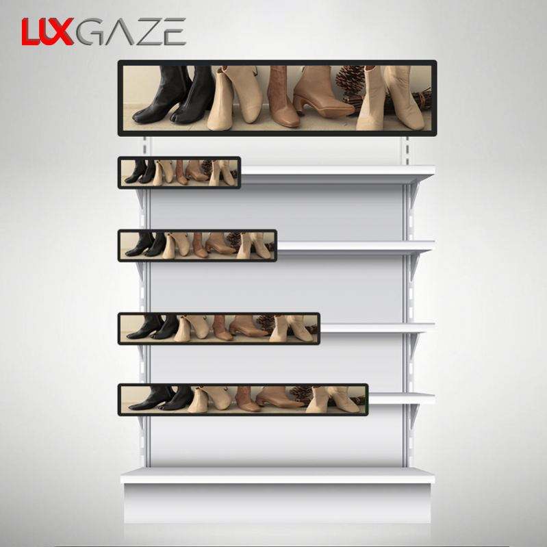 LuxGaze Pantalla LCD Flexibilidad Venta al por menor Supermercado Estante Borde Barra de estiramiento ultra ancha Pantalla LCD Pantalla de publicidad