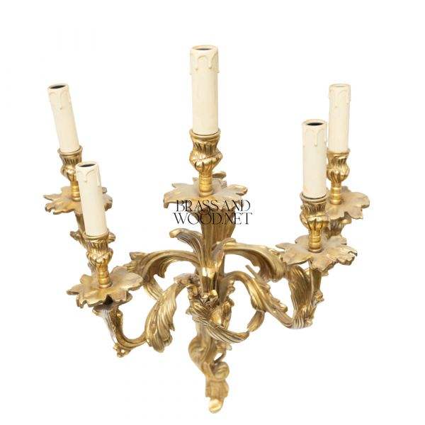 Lujoso aplique de pared clásico en latón macizo con acabado dorado antiguo y seis brazos estilo vela para una decoración elegante de iluminación para el hogar