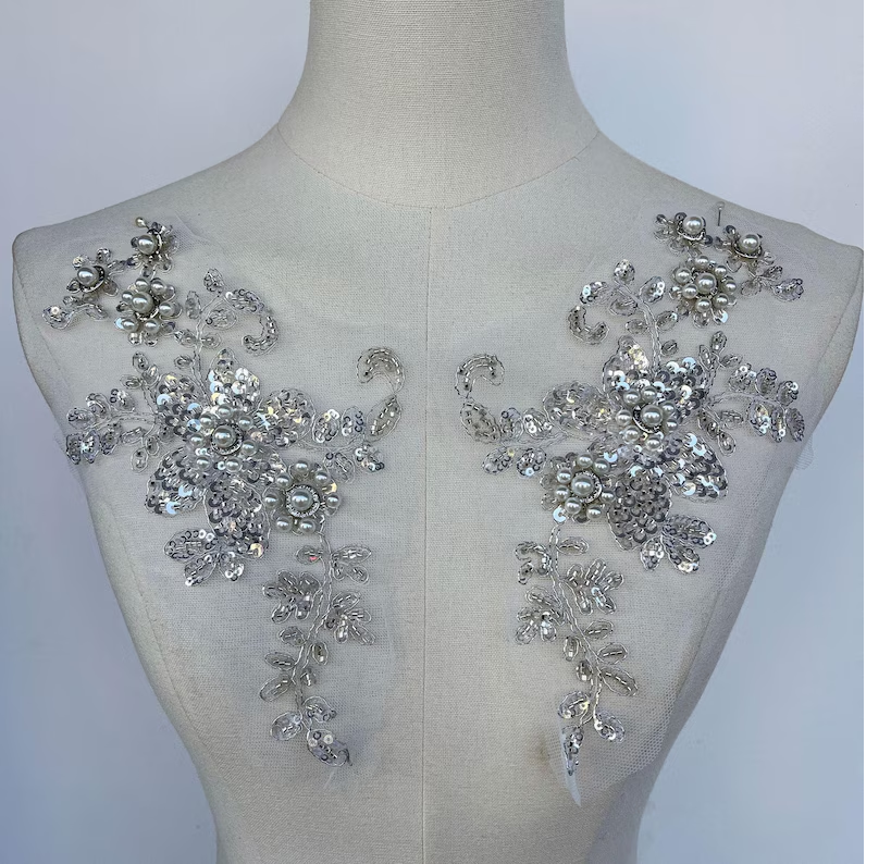 Parches cosidos de perlas y diamantes de imitación florales hechos a mano de lujo con tela Polymesh para DIY vestidos de novia y vestidos de noche/moda