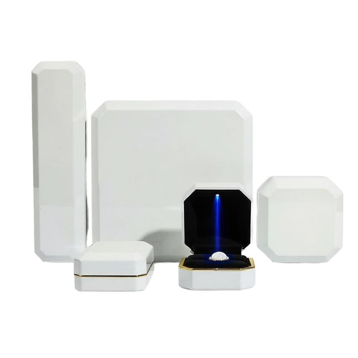 Caja de Joyería Octogonal de Lujo con Luces LED, Caja de Almacenamiento para Anillos, Colgantes y Collares, Diseño Blanco, Etiquetas Adhesivas con Logotipo