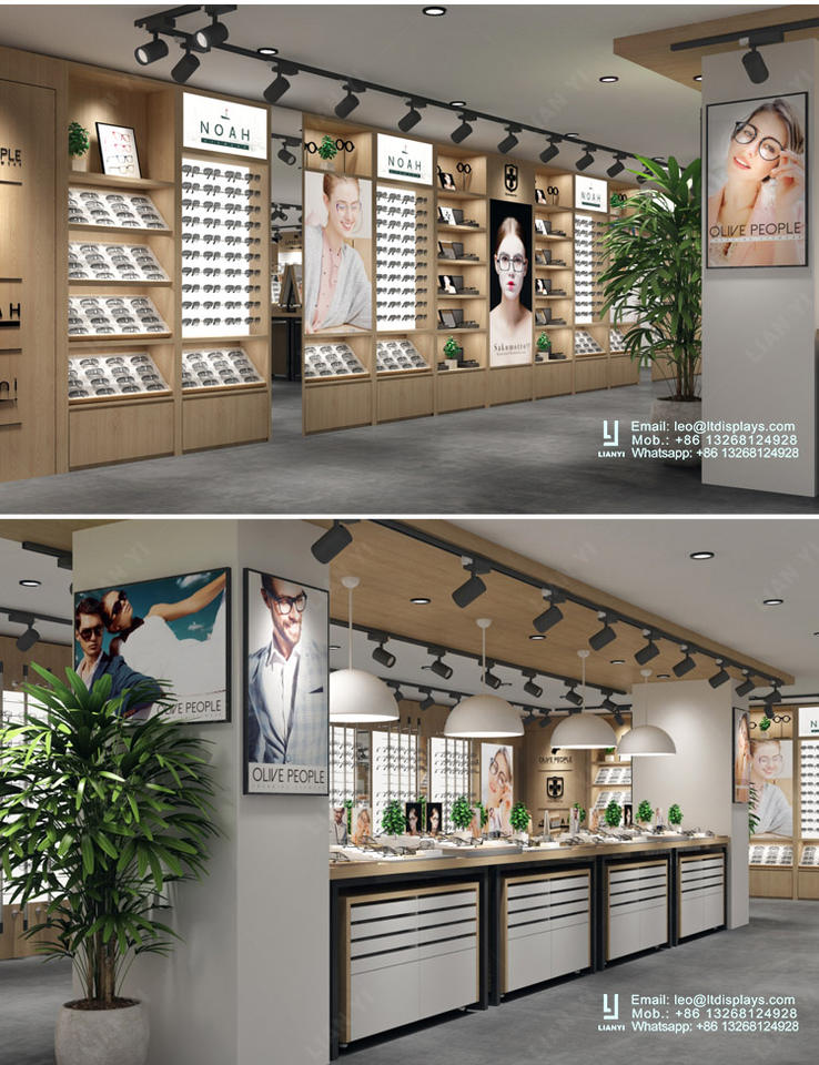 Lujosa tienda óptica Diseño de interiores Diseño Decoración Iluminación LED Gafas de sol Vitrinas Madera + Color de construcción de metal