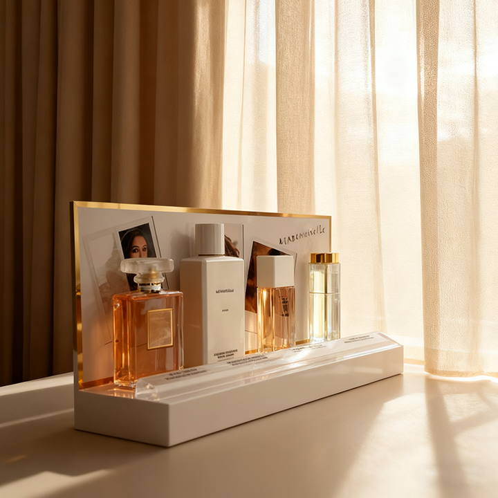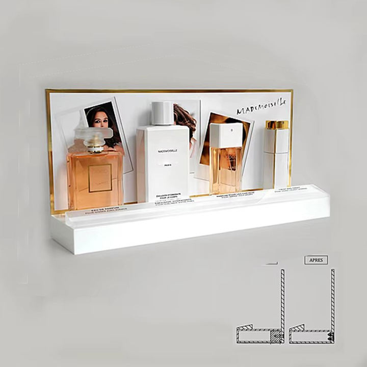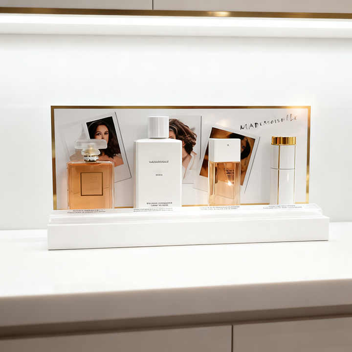 Diseño único de lujo Acrílico Blanco Cosméticos Exhibición Encimera Soporte cosmético Soporte de exhibición de perfume para Centro Comercial