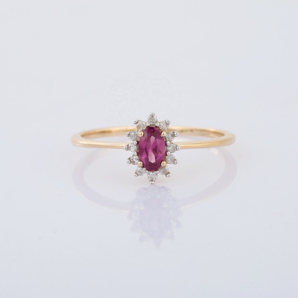 Anillo de racimo de diamantes de corte de piedra facetada ovalada de rodolita de oro amarillo sólido de 14 quilates de lujo para bodas y fiestas