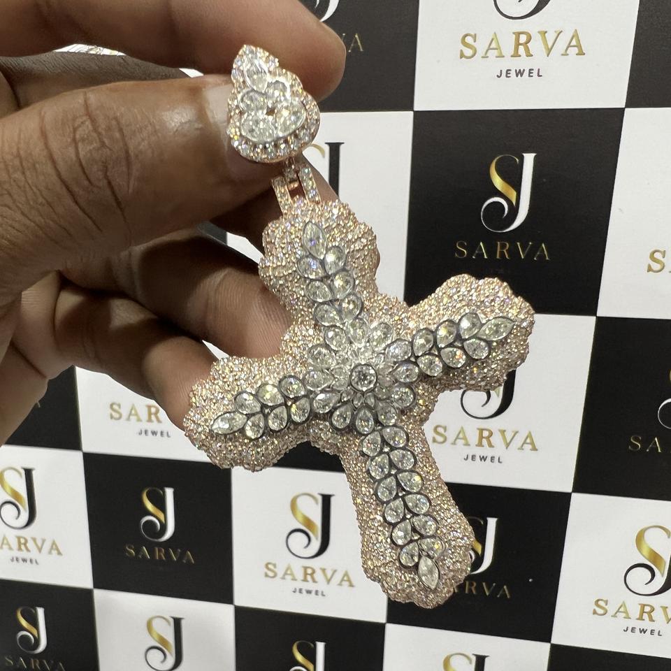 Colgante cruzado con acabado de oro rosa de 14K de lujo, detalle de diamante de corte Marquesa, joyería fina única de estilo Hip Hop para hombres con certificación IGI