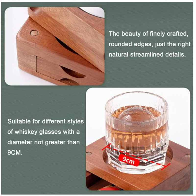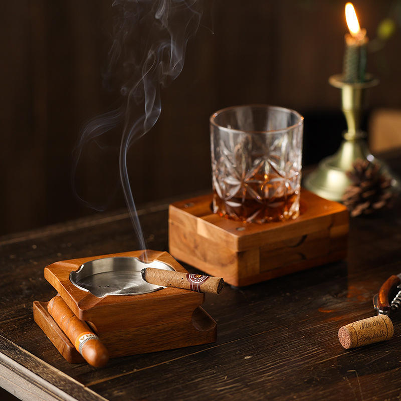 Cenicero de Puros de Lujo con 4 Ranuras, Madera y Portavasos de Whisky con Cajón para Patio Exterior, Hogar u Oficina, Regalo para Hombre