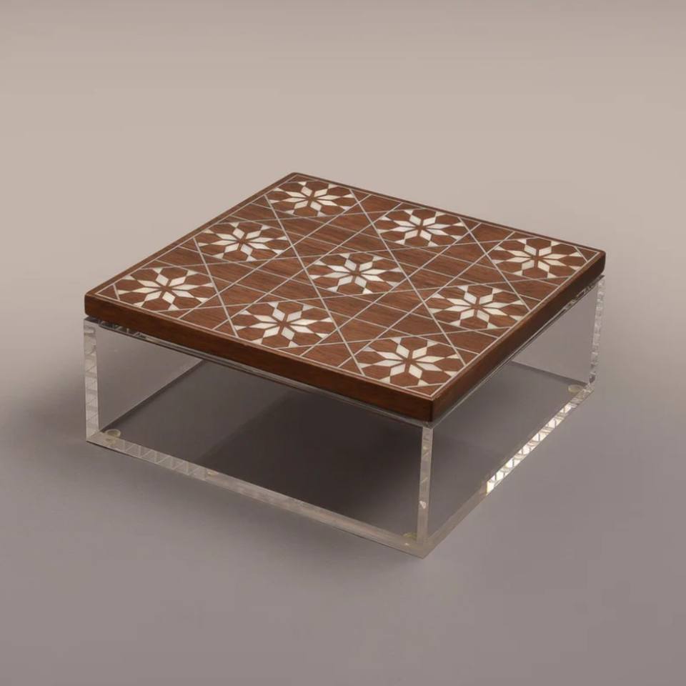 Caja de chocolate de acrílico de lujo con tapa de madera con incrustaciones de madre perlaNombre del producto