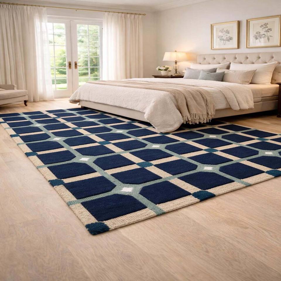 Alfombra de Lujo con Bucle Completo, Alfombra Geométrica Azul, Alfombra de Lana Suave, Alfombra de Diseño Hecha a Mano para Sala de Estar, Dormitorio, Decoración Contemporánea