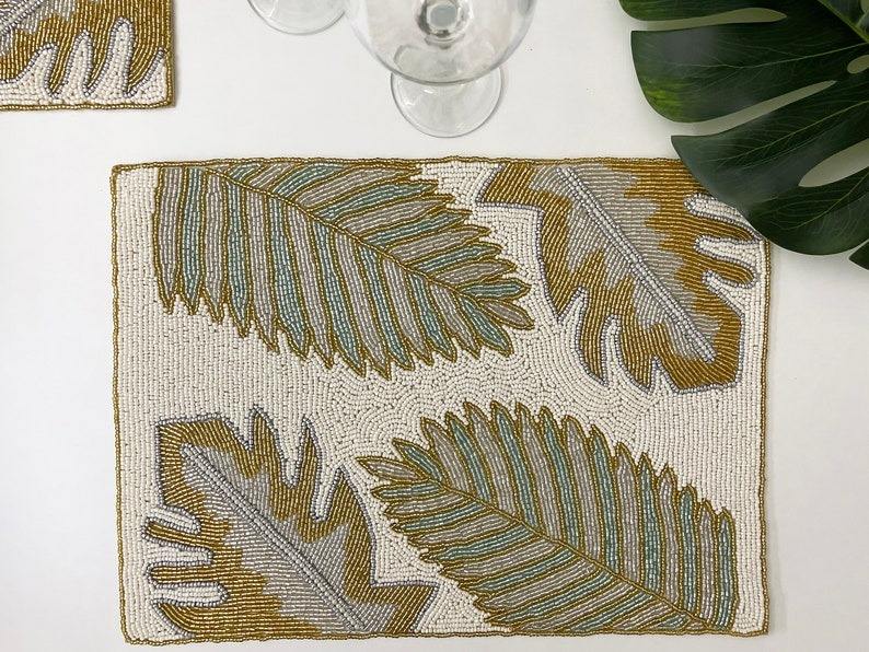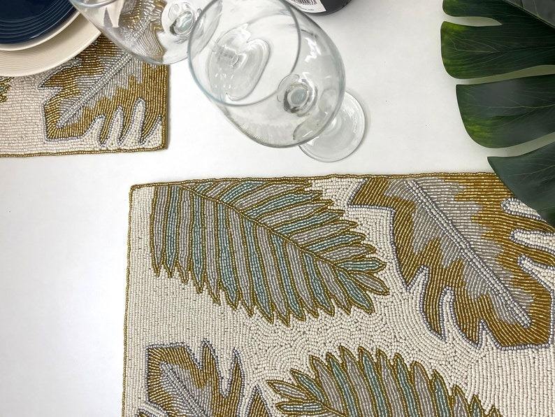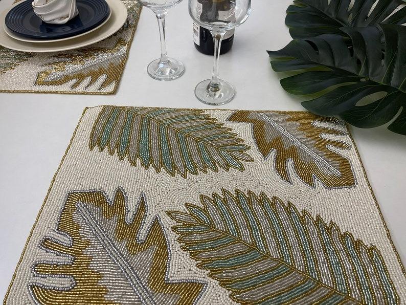 Juego de Manteles Individuales de Lujo con Cuentas, 6 Piezas, Tejidos de Paja, Aislantes, Ecológicos, Hechos a Mano, Bordados, Personalizables, Color Crema y Naranja Quemado, 36 cm