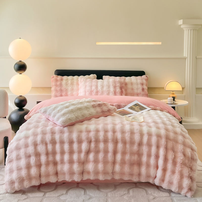 Juego de Sábanas de Lujo de 4 Piezas con Diseño de Burbujas Grandes, Imitación Piel de Conejo, Funda de Edredón, Cubrecama Grueso, Sábana Plana, Juego de Ropa de Cama para Invierno