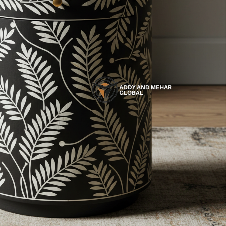 Mesita de Noche/Mesa Auxiliar de Lujo con Incrustaciones de Hueso Negro y Diseño Floral, Mesa de Noche Artesanal de Tres Cajones en Venta
