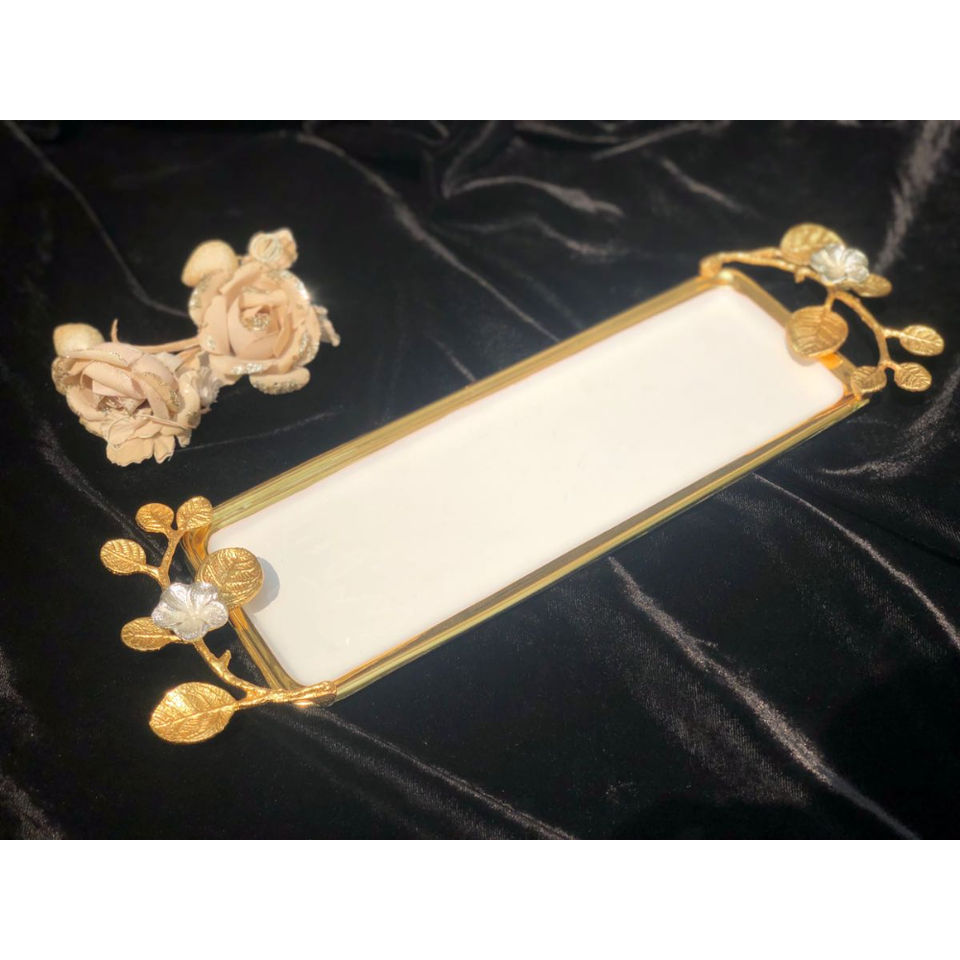 Bandeja de servicio negra de lujo con asas de hojas doradas Plato decorativo elegante para el hogar Cocina Comedor y uso en bodas