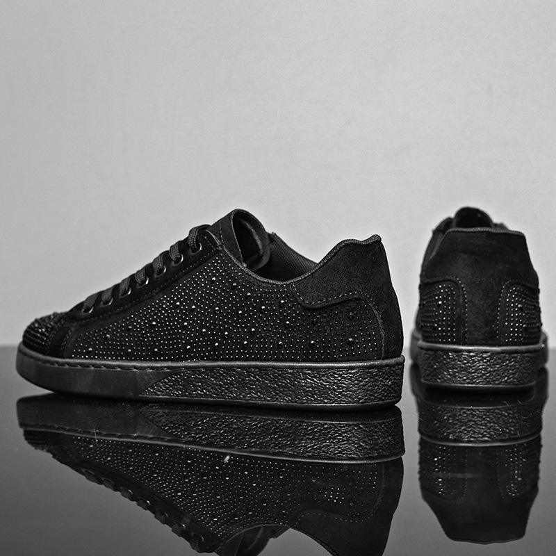 Zapatillas Deportivas de Lujo para Hombre, de Gamuza Negra con Cordones, Decoradas con Cristales y Pedrería, Estilo Deportivo, Color Sólido Otoñal, con Punta Reforzada