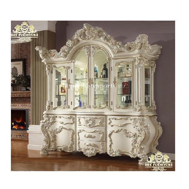 Vitrina de Comedor Formal Tallada de Lujo, Gabinete Victoriano Tallado con Acabado Blanco Brillante, Gabinete Clásico Tallado y Vitrinas