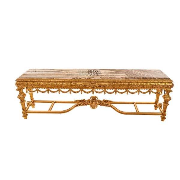 Mesa de Centro Clásica de Lujo, Madera Artesanal con Base Tallada y Bañada en Oro y Tapa de Mármol, Muebles de Estilo Francés