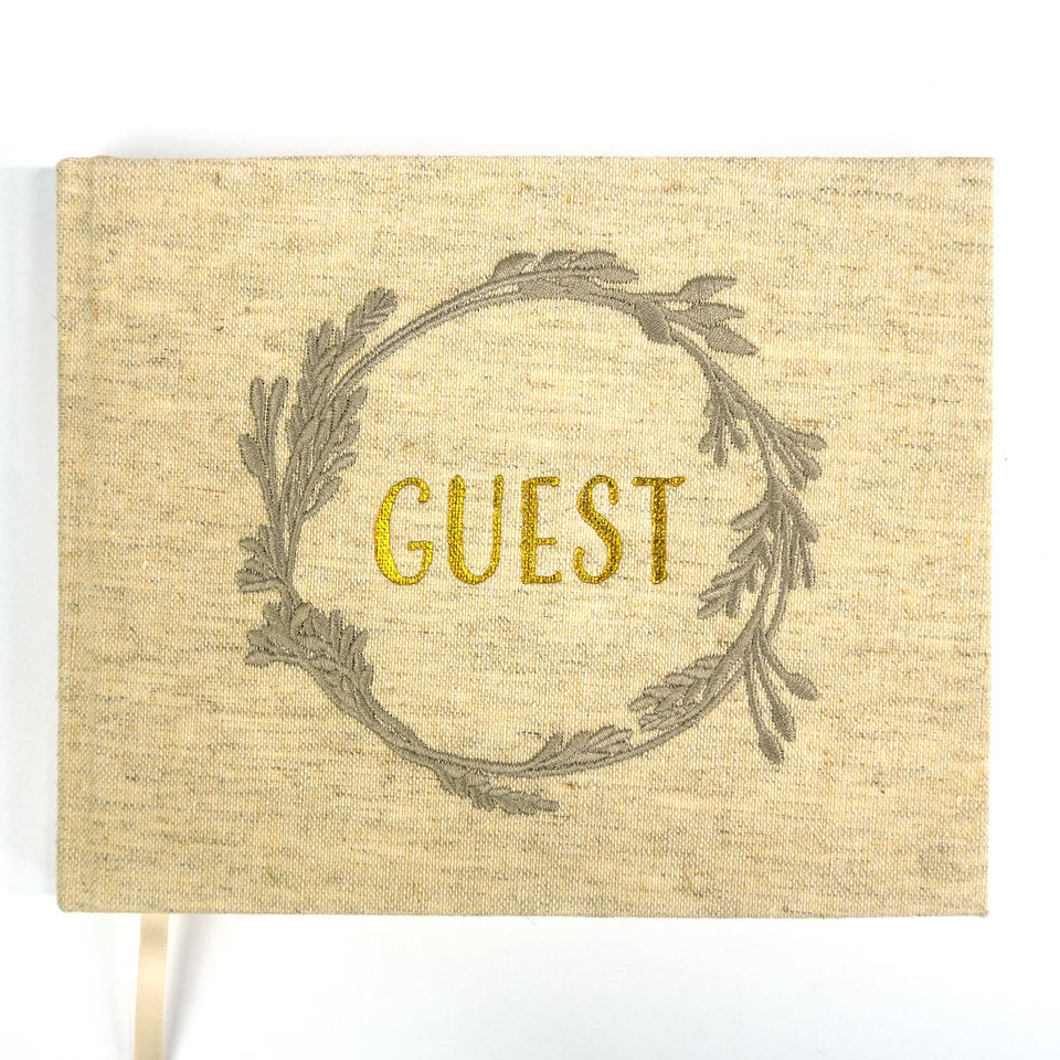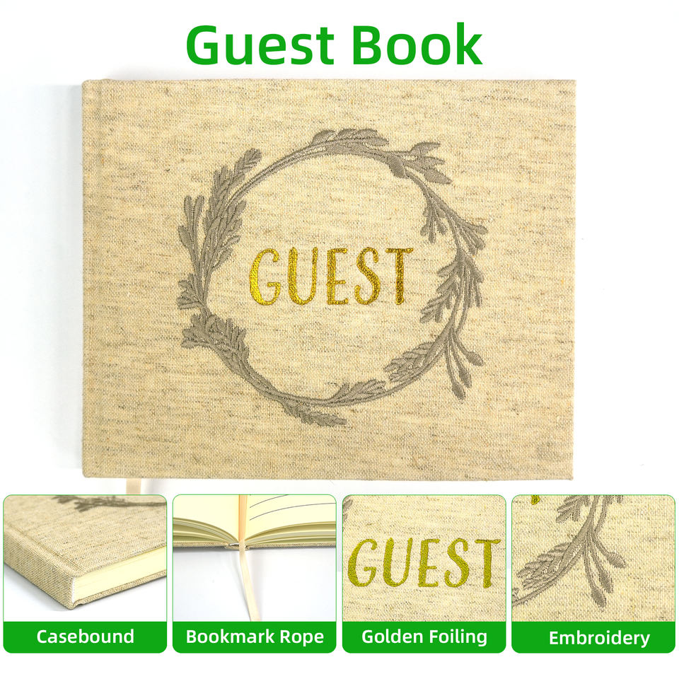 Lujo personalizado oro frustrado cubierta de lino bordado boda libro de invitados con caja de papel y pluma