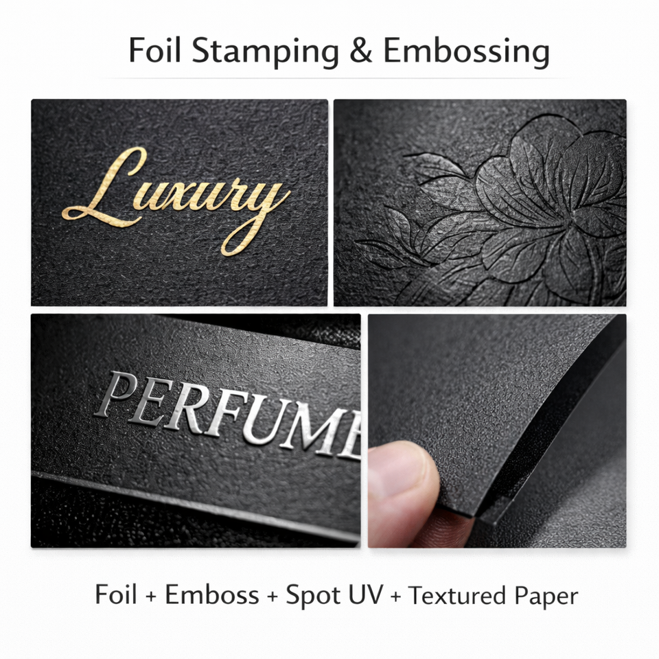 Relieve, Laminación brillante, Laminación mate, Estampado, Revestimiento UV, Barnizado