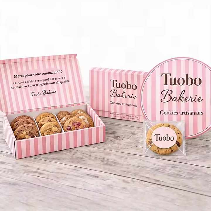 Cajas de lujo personalizadas en rosa para galletas — packaging para pastelería: macarons, trufas de chocolate, pasteles y galletas