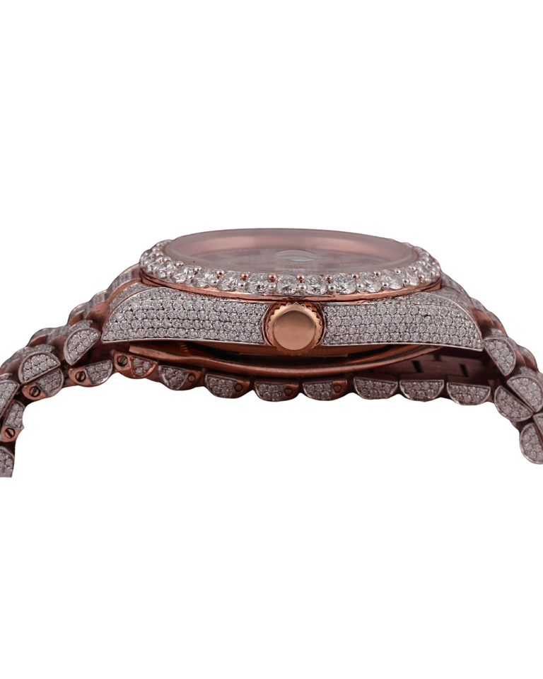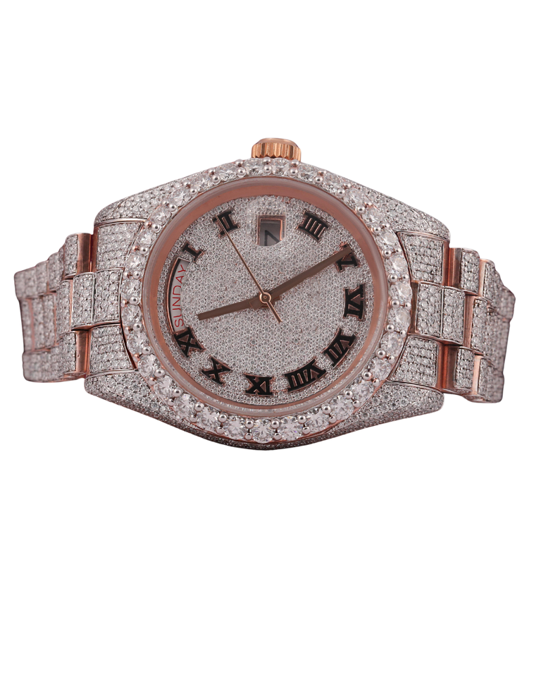 Reloj de lujo personalizado en oro rosa con diamantes de moissanita de forma personalizada para hombre, con esfera blanca personalizada y diseño único.