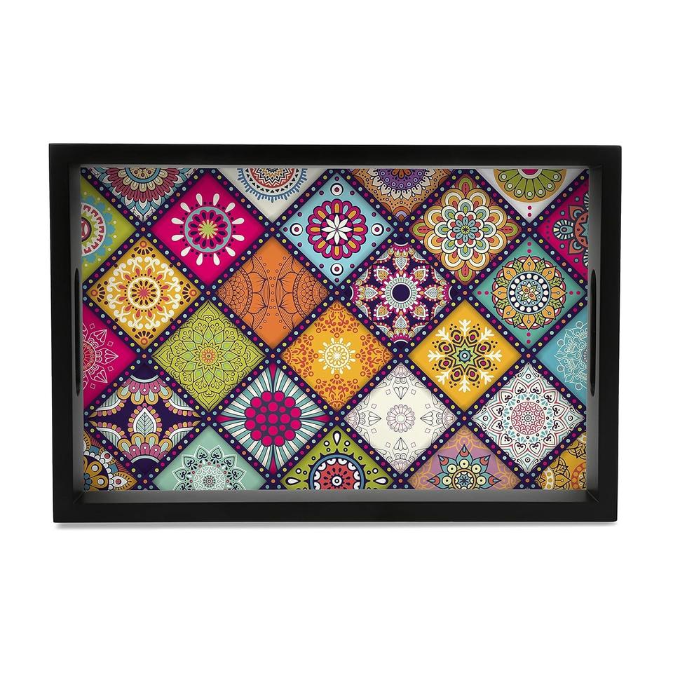 Bandeja de Servir Rectangular de Diseño de Lujo con Estampados Florales, Hecha a Mano con Madera de Mango