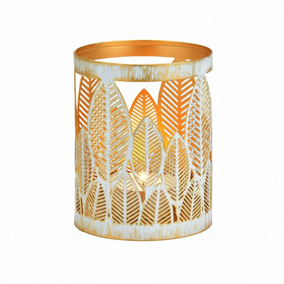 Soporte de luz de metal de lujo de 10x13cm con patrón de hoja dorada Gran calidad para té y velas Decoración del hogar