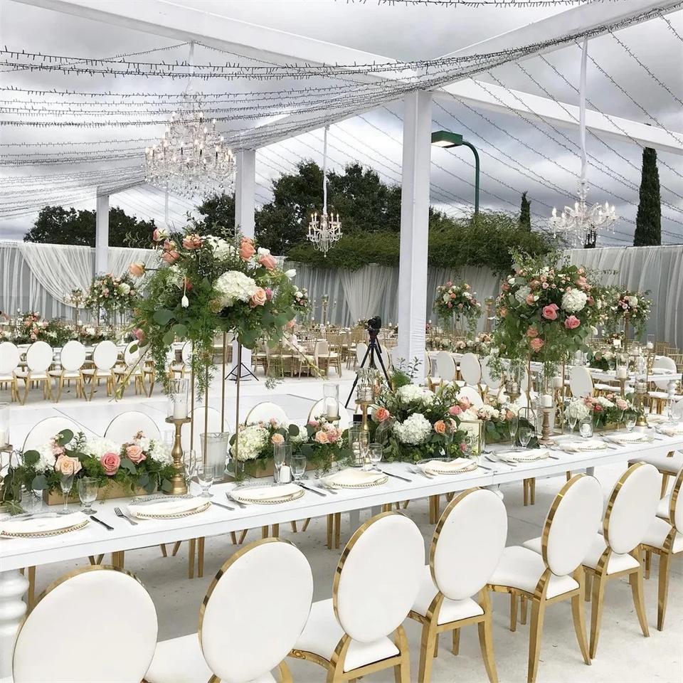 Silla de lujo para eventos con diseño de respaldo redondo, dorada, de acero inoxidable, para hoteles, decoración, con mesa, silla para banquetes, bodas y eventos en hoteles